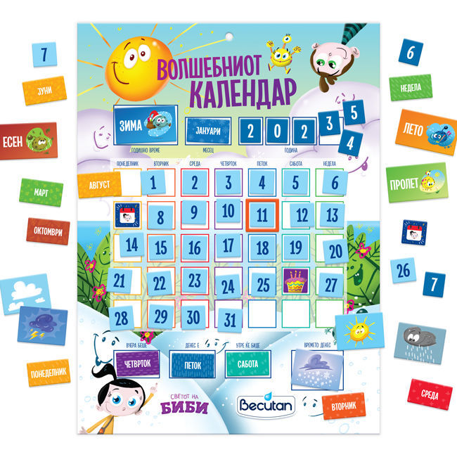 Волшебниот календар е совршена алатка која ќе му помогне на вашето дете да ги научи деновите во неделата, месеците, датумите и бројките, годишните времиња... Преку овој интерактивен календар со магнети ќе го запознаете детето со концептот за времето, ќе го научите како се користи календар, кога му е роденден или кога има некој празник.
