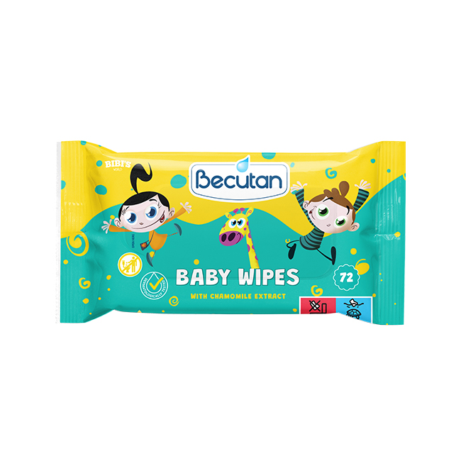 - Becutan влажни марамчиња со камилица, надополнети со мирис на гума за џвакање кој дополнително го зголемува чувството на задоволство и радост кај децата.