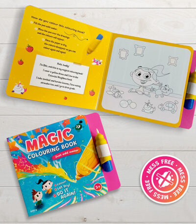 „Водена боенка Светот на Биби“ е иновативна и забавна активност за најмалите дечиња што комбинира игра и учење преку боја – без боички и моливи. Со специјална четка што се наполнува со вода, детето само поминува преку страниците и магично се појавуваат шарени бои и илустрации. Откако страниците ќе се исушат, боите исчезнуваат, што значи дека книгата може повторно да се користи за бескрајна забава.