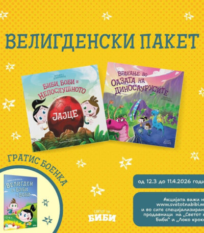 Внесете ја магијата на Велигден во домот со специјалниот пакет од „Светот на Биби“. Пакетот ги содржи сликовниците „Биби, Боби и Непослушното јајце“ и „Враќање во оазата на диносаурусите“, а како подарок добивате и боенка „Велигден со Биби и Боби“.