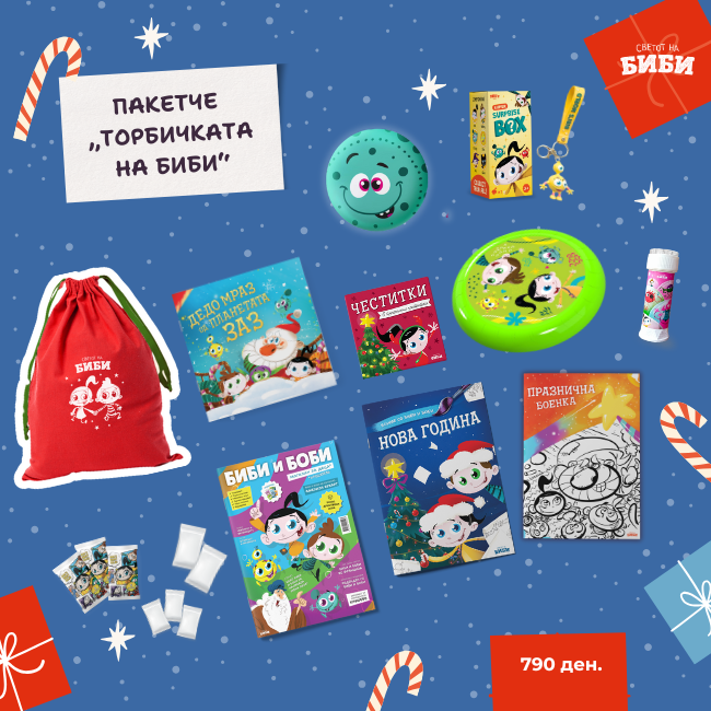 Пакетот содржи: Топка, Suprise BOX (Привезок со лик од „Светот на Биби“), , Новогодишна сликовница со Дедо мраз од Заз, Новогодишна боенка, Празнична боенка,:Честитки, Магазин „Биби и Боби“, Фризби, 3 кесички со сликички, Специјални сликички и сапуница