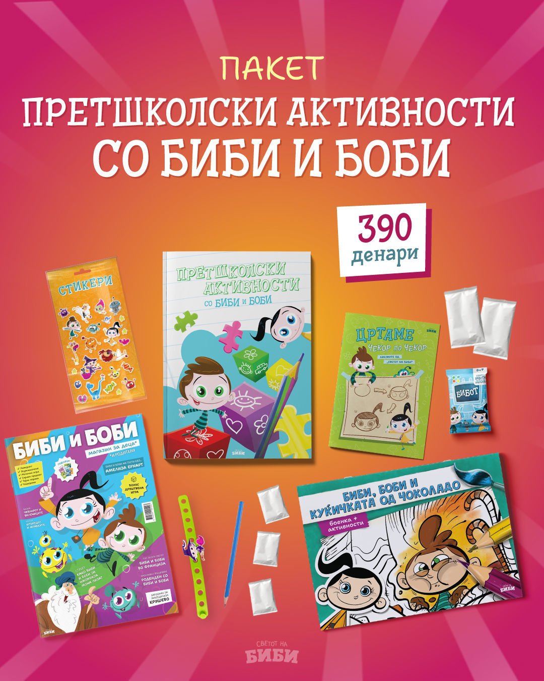 Состав на пакетот: ПРЕТШКОЛСКИ АКТИВНОСТИ СО БИБИ И БОБИ, АКТИВНОСТИ: ЦРТАМЕ СО БИБИ И БОБИ, БОЕНКА БИБИ БОБИ И КУКИЧКАТА ОД ЧОКОЛАДО, СТИКЕРИ LASER CUT, МОЛИВ, АЛКА СО ЛИК ОД СВЕТОТ НА БИБИ, ЕДУКАТИВНО СПИСАНИЕ за ДЕЦА БИБИ И БОБИ, БИБОТ КЕСИЧКА, СПЕЦ. СЛИКИЧКИ СО КАРТИЧКА *3, СПЕЦ СЛИКИЧКИ *3
