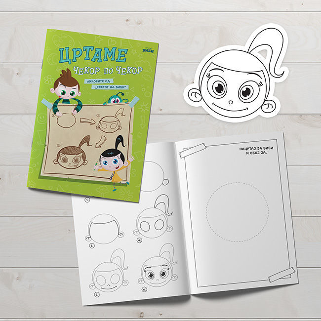 „Цртаме чекор по чекор со Биби и Боби – Нацртај ги ликовите“ е креативна и едукативна книга што им помага на децата лесно и самоуверено да научат да цртаат. Преку јасно прикажани чекори и едноставни форми, малите уметници постепено ги создаваат омилените ликови Биби, Боби и нивните пријатели.
