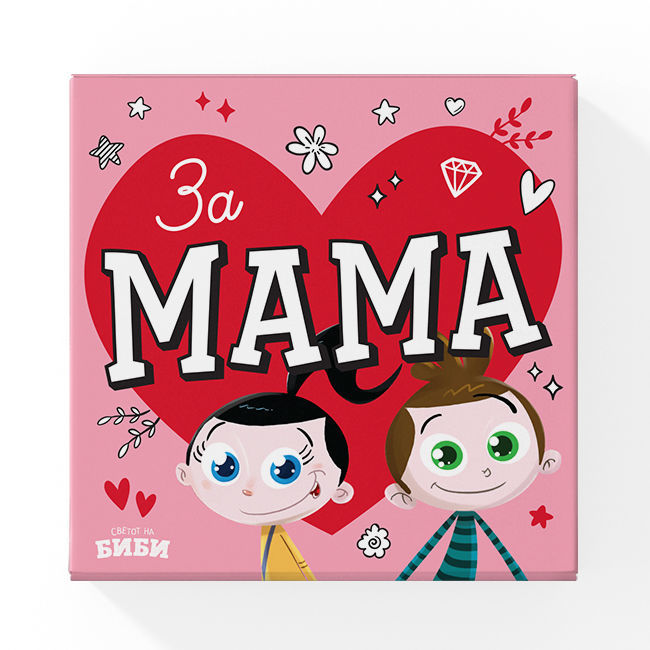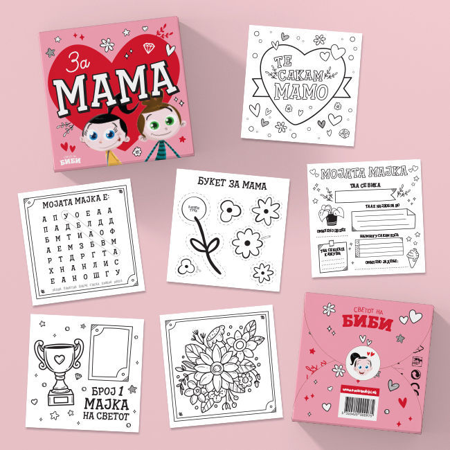 „За мама“ е посебен сет од 6 уникатни картички – боенки и честитки дизајнирани како подарок за мајки. Секоја картичка содржи различна активност што децата можат да ја обојат и персонализираат, создавајќи вредни спомени и изразувајќи љубов кон својата мајка на креативен начин.